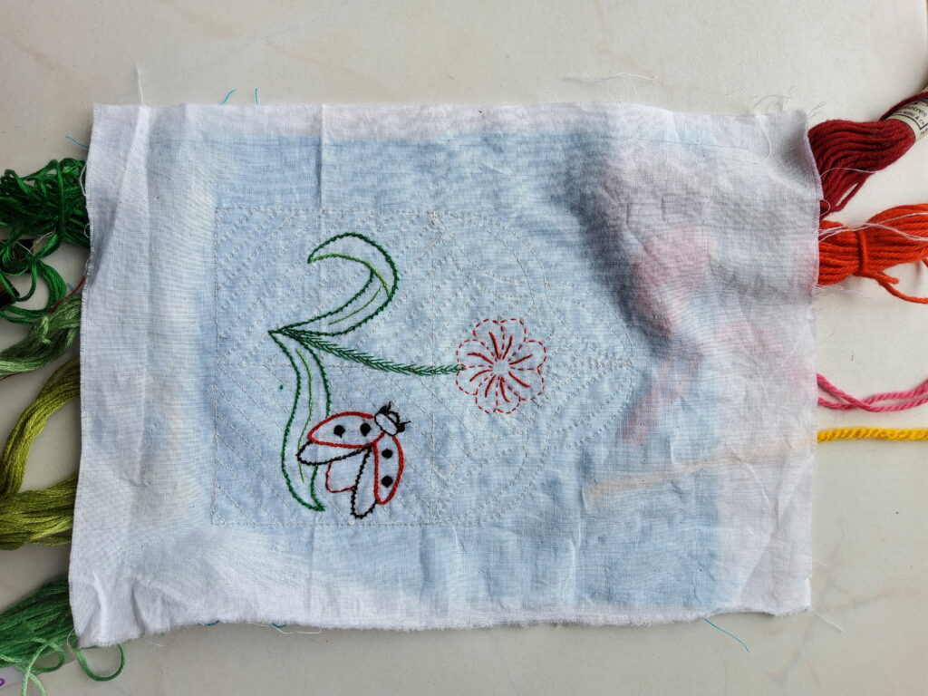 De manière générale, plus la couleur est foncée, moins elle ressort sous la batiste. Le rouge bordeaux et le vert foncé sont donc à exclure. Le jaune garde sa couleur d’origine. Pour les feuilles, le vert le plus clair sort sous forme de vert jaune et j’hésite entre celui-ci et un vert moyen… A voir !