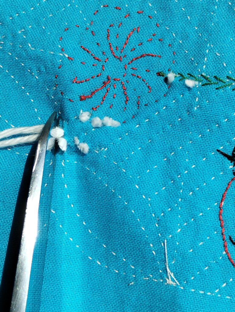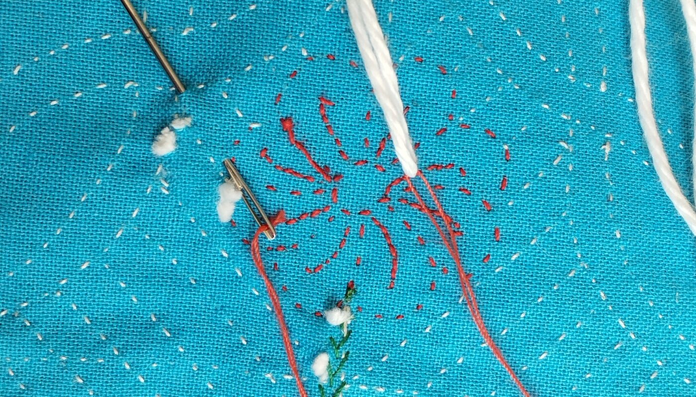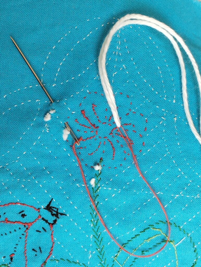 Finis les petits points pour tracer le motif du boutis. Voici venu le temps du méchage.