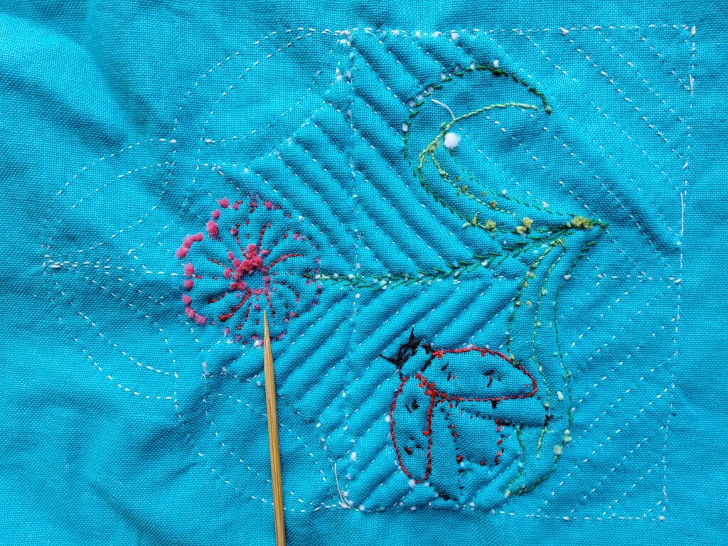 Piquez dans la toile de coton, passez votre aiguille entre les deux couches de tissu et ressortez à l’autre bout du motif à mécher.