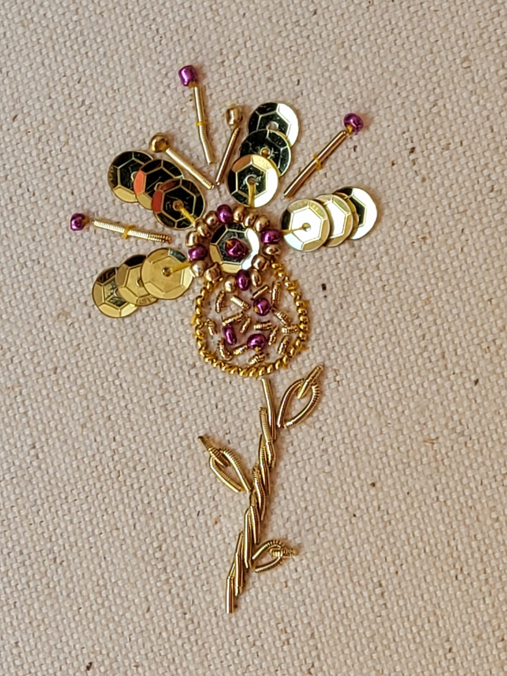 Matériel fourni : Tissu, cannetille, jaseron, fils, aiguille, support de cours
